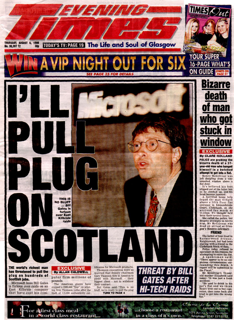 On the front page of Glasgow's Evening Times newspaper on 6th Aug has a big pic of Bill Gates and the headline: "I'LL PULL PLUG ON SCOTLAND"!!!!